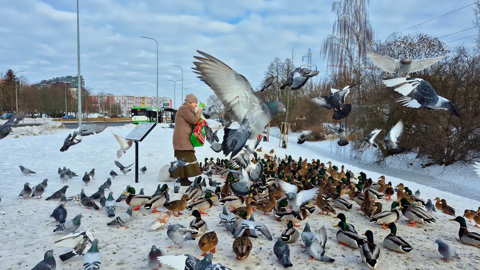 – To są moi podopieczni – mówi o stadzie kaczek i gołębi pani Teresa, która codziennie przynosi im specjalną karmę. Dodaje, że po pierwszej fali mrozów, rzeka, przy której przebywają, zamarzła i ptaki nie mogły żerować. Ktoś jednak wyciął profesjonalny przerębel i ptaki odzyskały dostęp do wody.