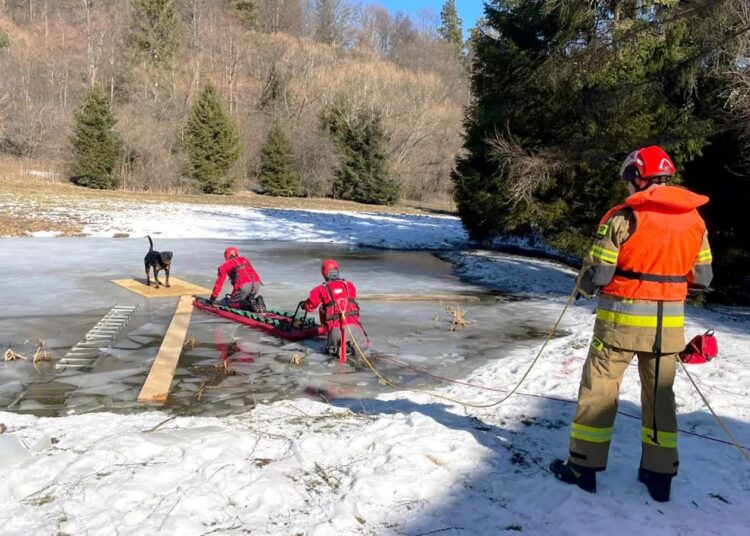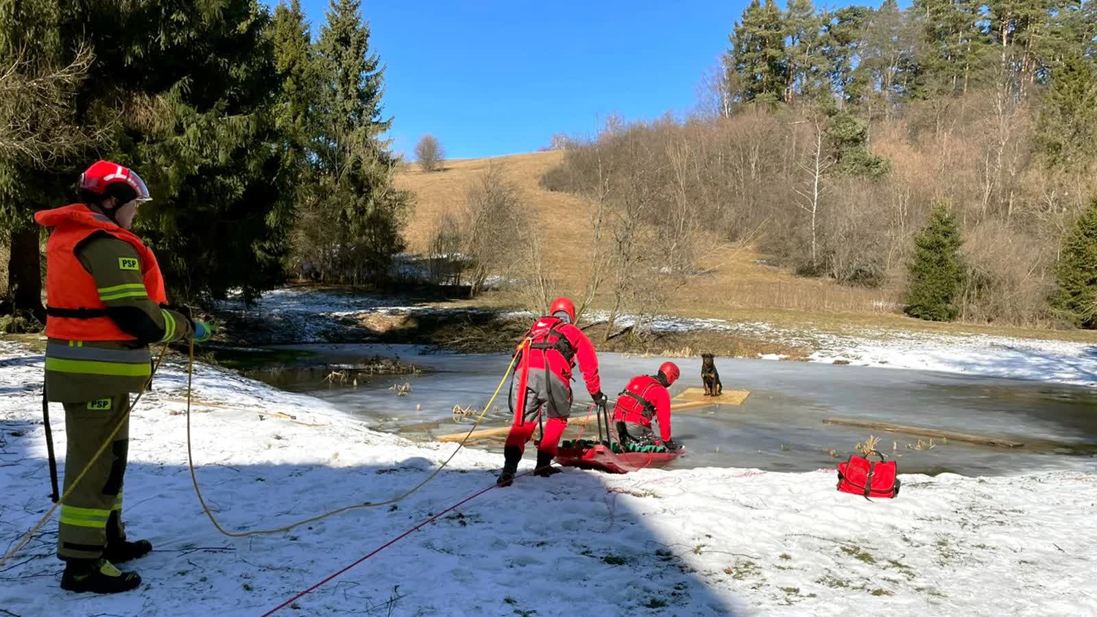 Strażacy uratowali psa, który utknął na zamarzniętym stawie