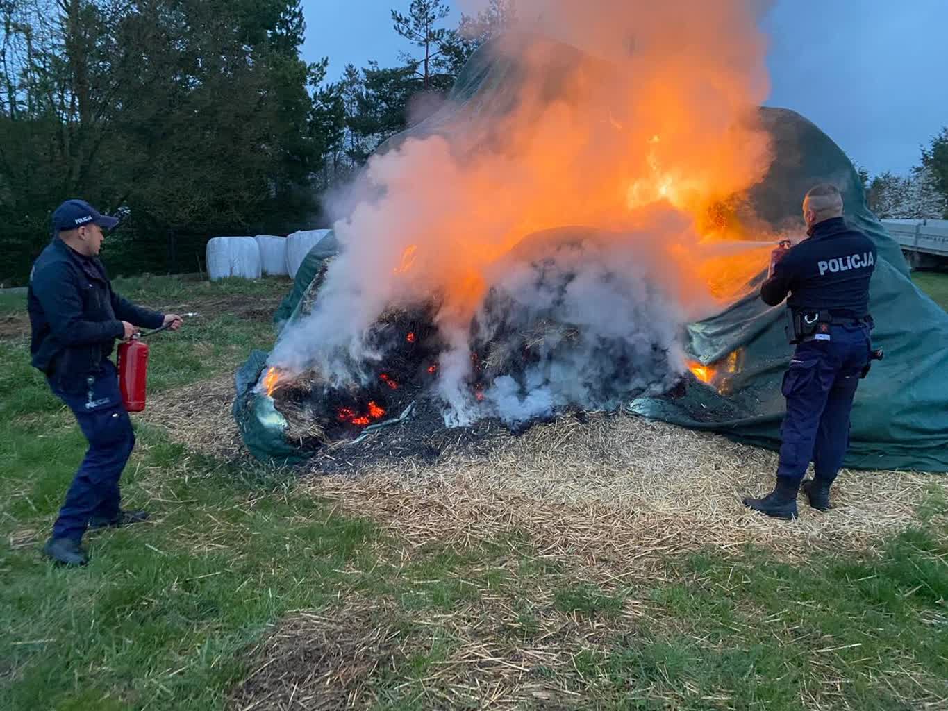 Okazało się, że pożar zauważyli policjanci, którzy zostali wezwani przez 30-letniego mężczyznę do tej miejscowości w związku z domową awanturą. Podczas interwencji zauważyli ogień. Pojawił się około 50 metrów od zabudowań, w miejscu składowania suchego siana. Funkcjonariusze sami próbowali opanować pożar, ostatecznie został ugaszony przez straż pożarną.